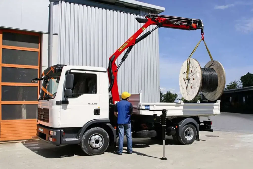 Transport trucks equipped with hydraulic cranes for self-loading. Allows lifting and moving materials without additional machinery. Useful for construction, logistics, and factory applications.